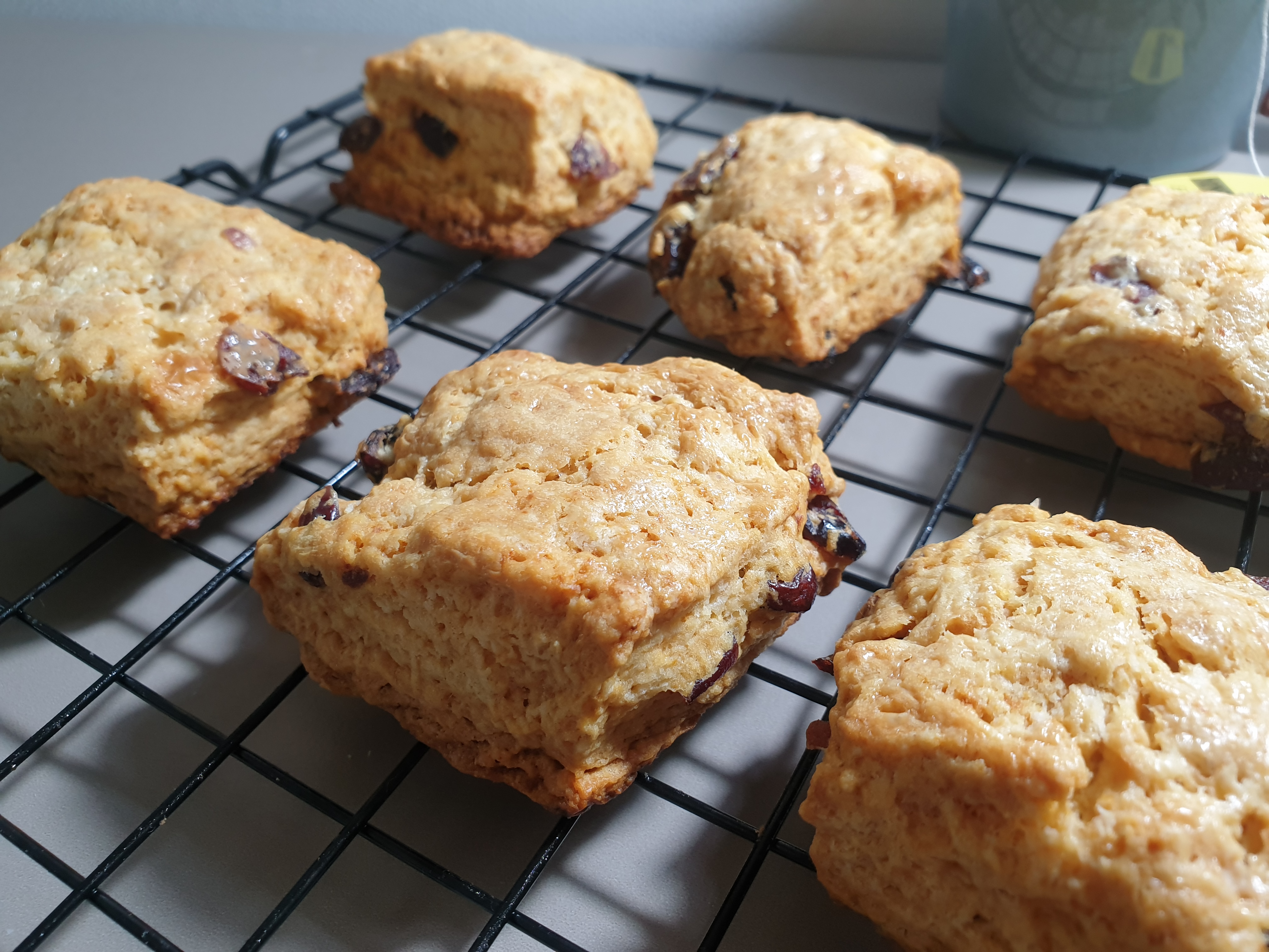 레시피에 따라 잘 구워진 스콘이라면 겉이 파사삭 할거예요. 처음에는 레이첼박 크랜베리스콘 원 레시피대로 만들어보시고, 입맛에 따라 크랜베리 양과 설탕량을 가감해보세요. 저는 한번에 너무 많이 먹게될까봐; 계량의 반배합씩해서 구웠어요(스콘 6개 분량)