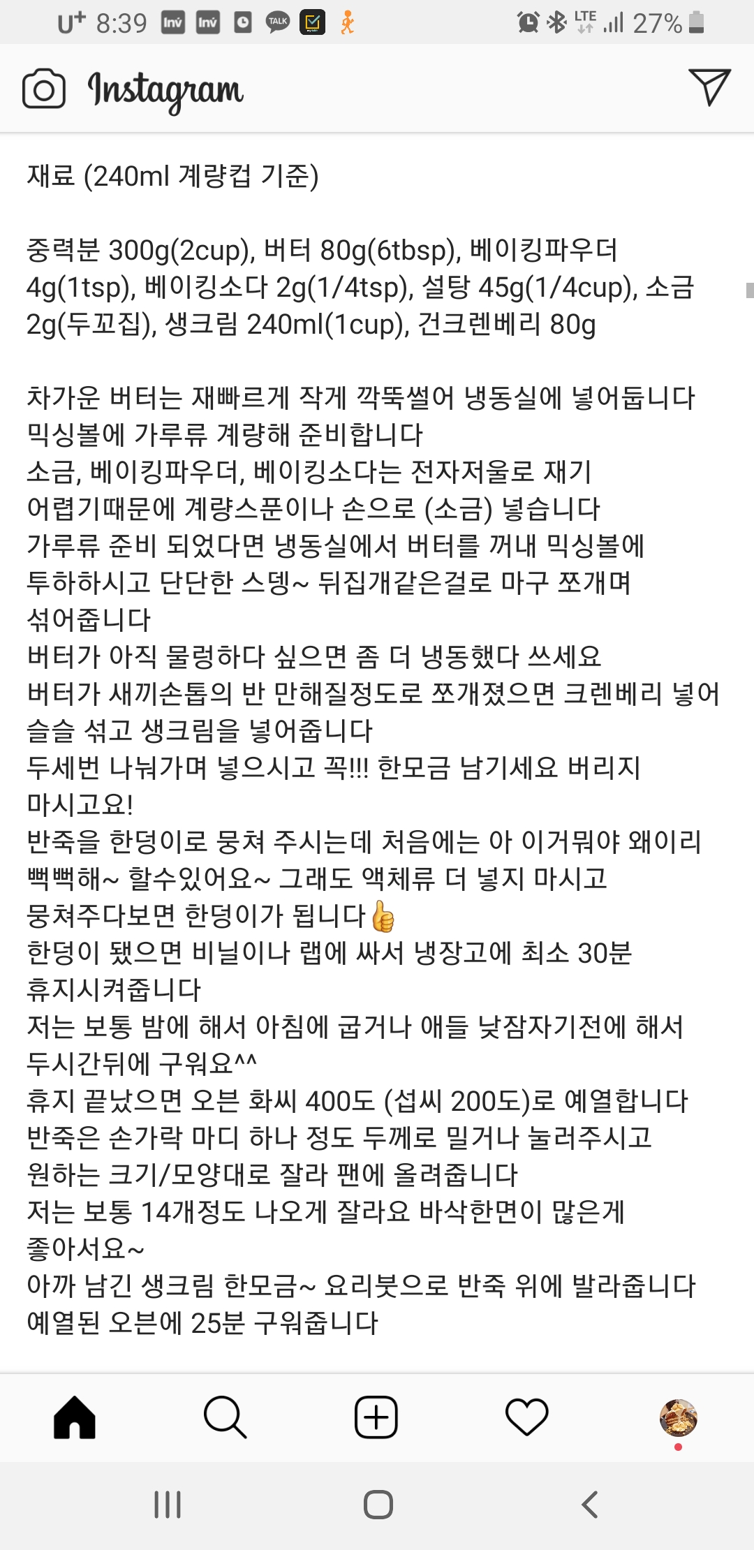 네이봐 요리카페인 "시크릿레시피"에 레이첼박님이 올리신 레시피인데, 이미 만들어보신 분들의 극찬하는 후기글이 넘쳐나는 맛보장 레시피입니다. 블로그나 유튜봐 검색을 통해 공개된 다양한 스콘 레시피가 있지만, 레이첼박 크랜베리 스콘은 카페에서 일정등급 이상이 되는 회원들에게만 공개된 시크릿레시피기 때문에 그 궁금증이 더해졌습니다. 올해 초였던가요? 시크릿레시피카페의 운영자인 마카롱여사님 인스타그램에서 24시간동안 반짝 레시피가 공개되기도 했었어요.