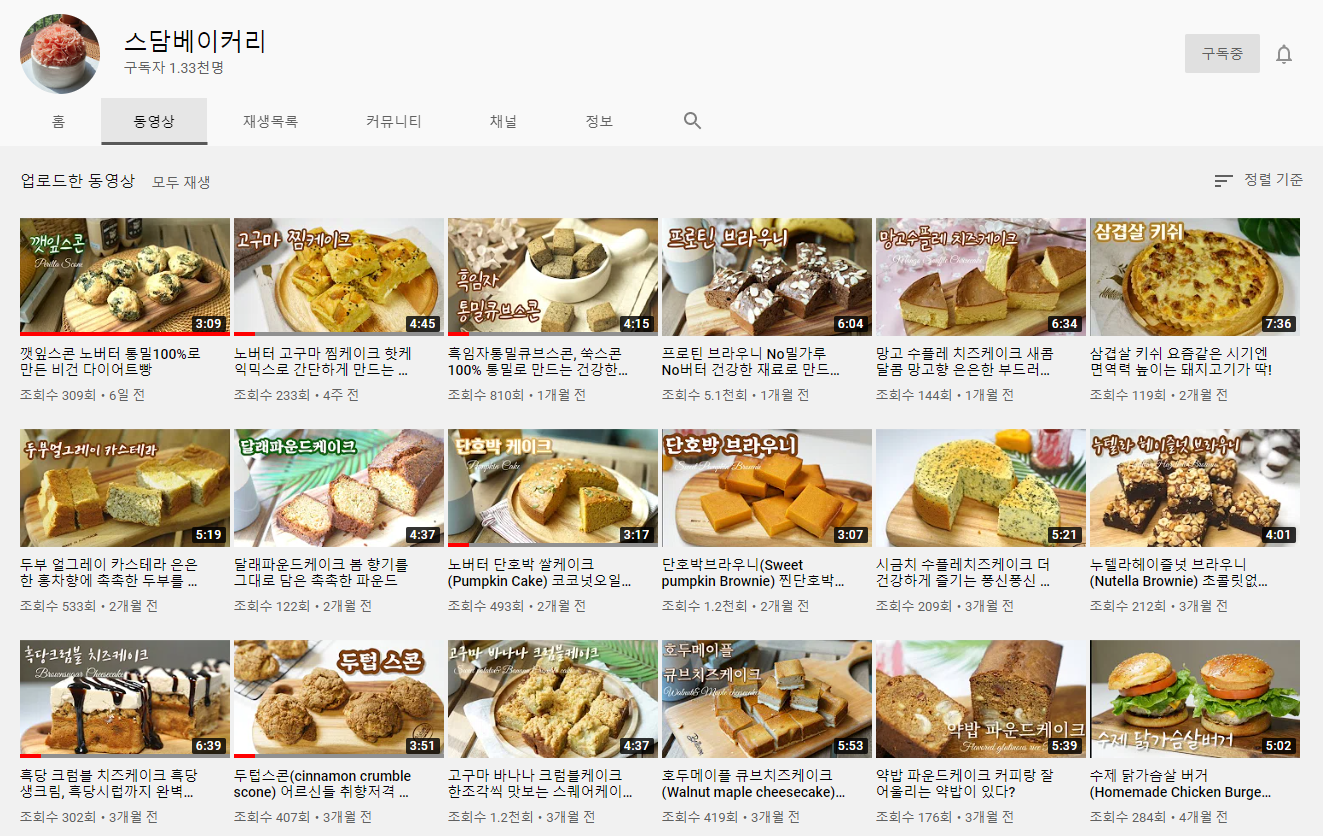 비건베이킹을 비롯한 건강베이킹을 지향하는 스담베이커리 채널입니다. 별스타그램에서 먼저 알게 됐는데요, 건강하고 맛있는 디저트들을 많이 소개해주셔서 정말 좋아하는 채널이예요.