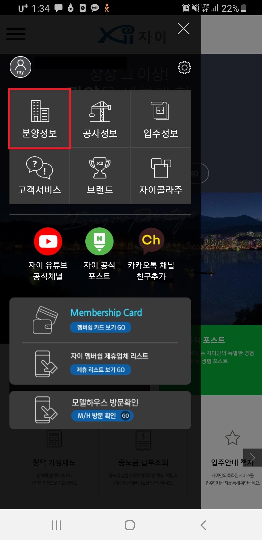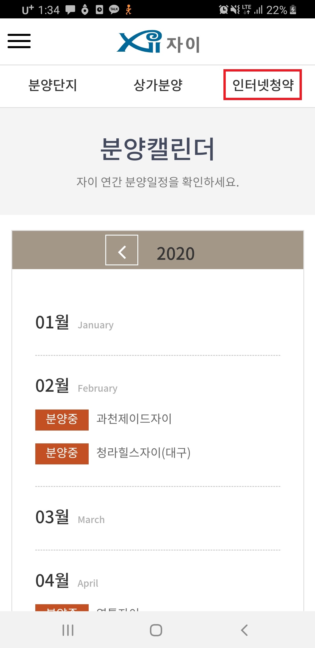 자이 앱을 설치후, 어플 실행해서 회원가입을 먼저 진행해야합니다. 분양정보 메뉴를 클릭하면 바로 아래와 같이 분양캘린더가 제일 먼저 뜨는데요. 하위 메뉴인 '인터넷 청약'이 숨어있어서 잘 못찾겠더라구요. 분양캘린더, 분양단지, 상가분양 이렇게 되어 있는 메뉴부분을 드래그 해서 우측으로 당겨주면 '인터넷청약'메뉴가 나타납니다. 클릭해주세요!