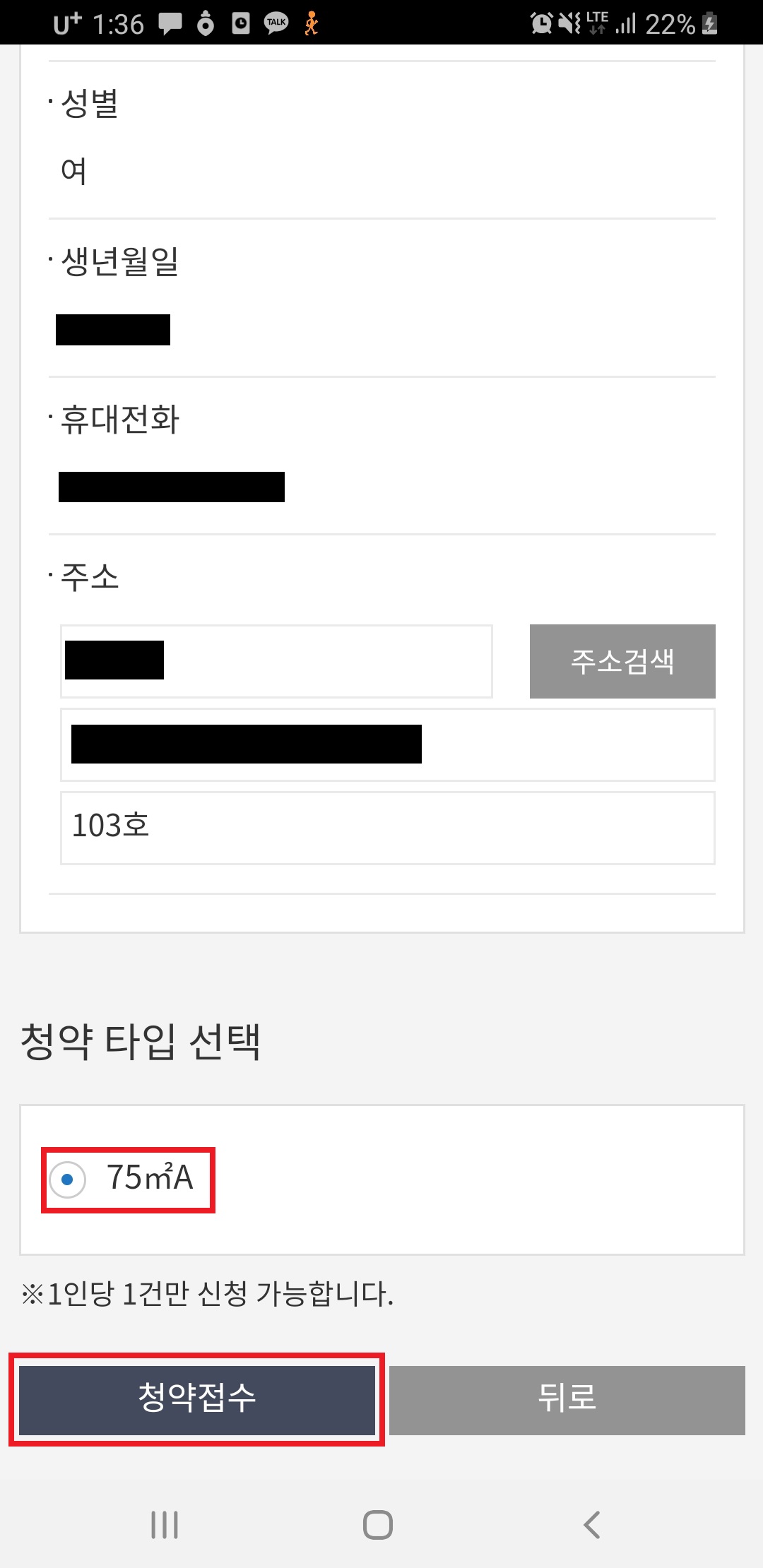 주소를 입력해주고, 청약접수버튼을 눌러주면 영통자이 줍줍 신청이 완료됩니다!