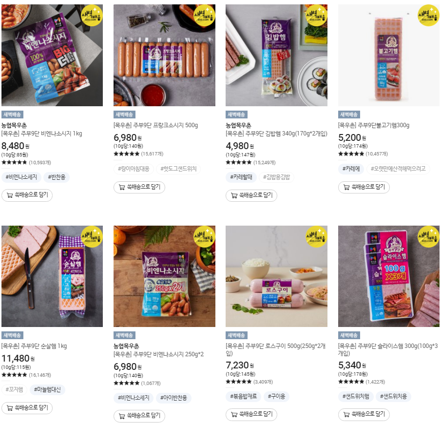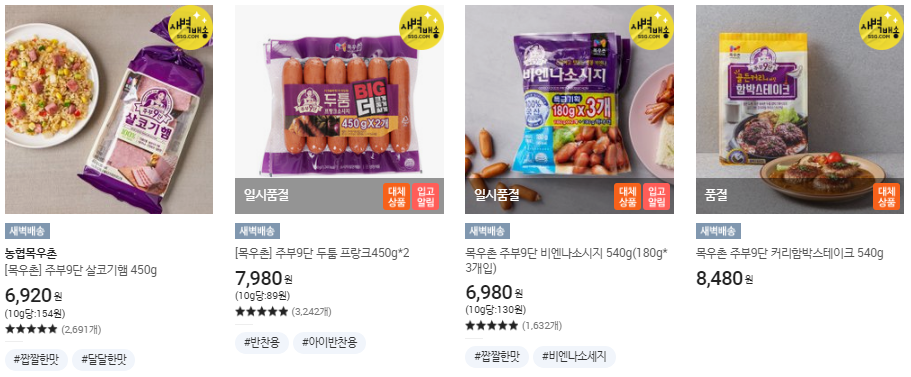 특히 추천하는 것은 가성비가 좋은 비엔나소시지, 프랑크소시지 입니다. 목우촌 주부9단 제품은 인기가 좋아서 쓱닷컴 새벽배송에서도 일시품절일 때가 많은데요, 입고알림 신청을 해뒀다가 입고가 되면 재빠르게 구매하는 게 팁!