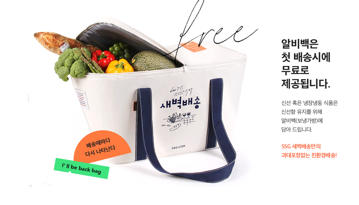 1. 알비백(보냉가방) : 재사용이 가능한 보냉가방(알비백을) 새벽배송 첫 구매시 무료로 제공됩니다. / 최대 9시간 보냉력 유지