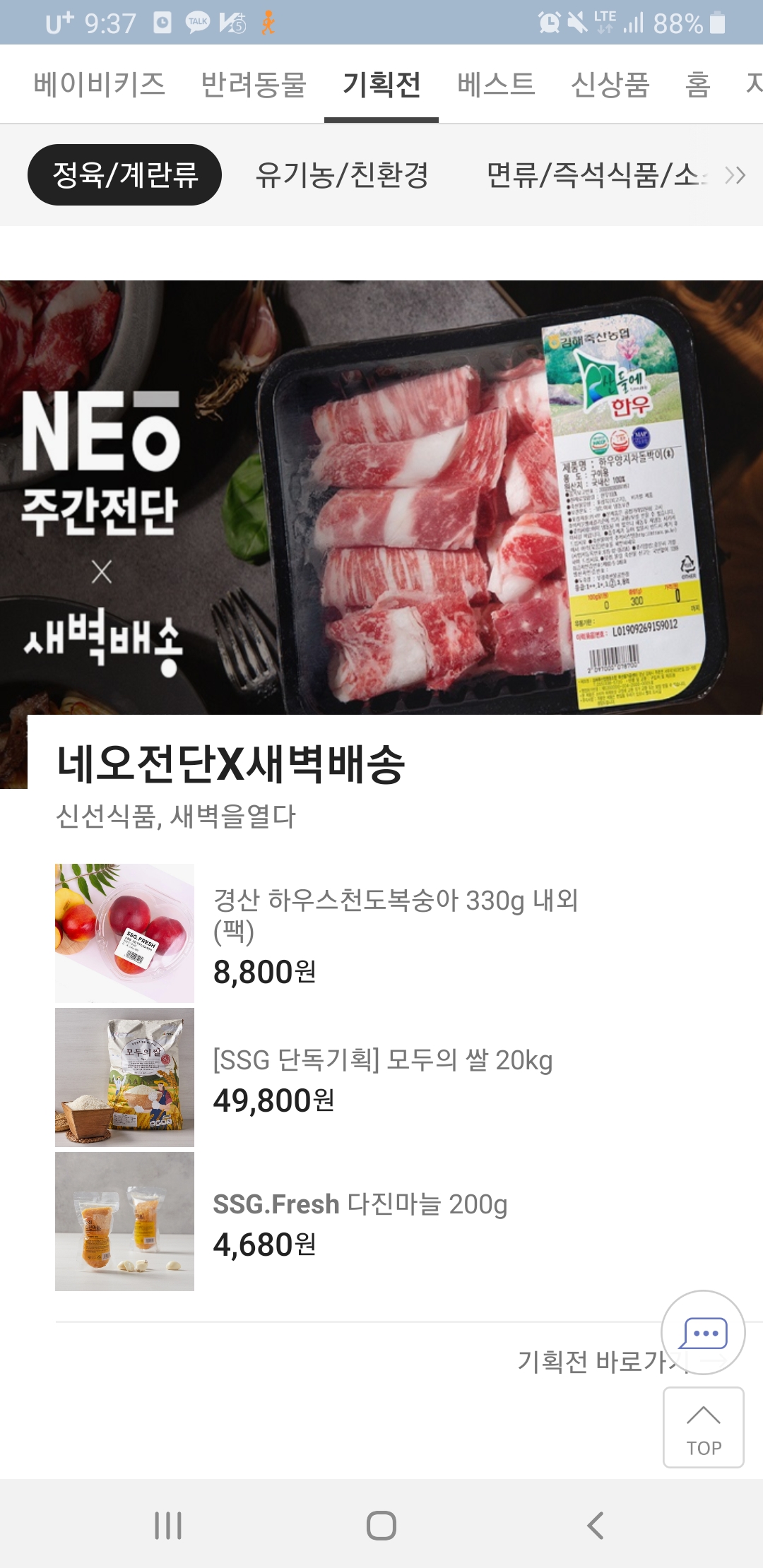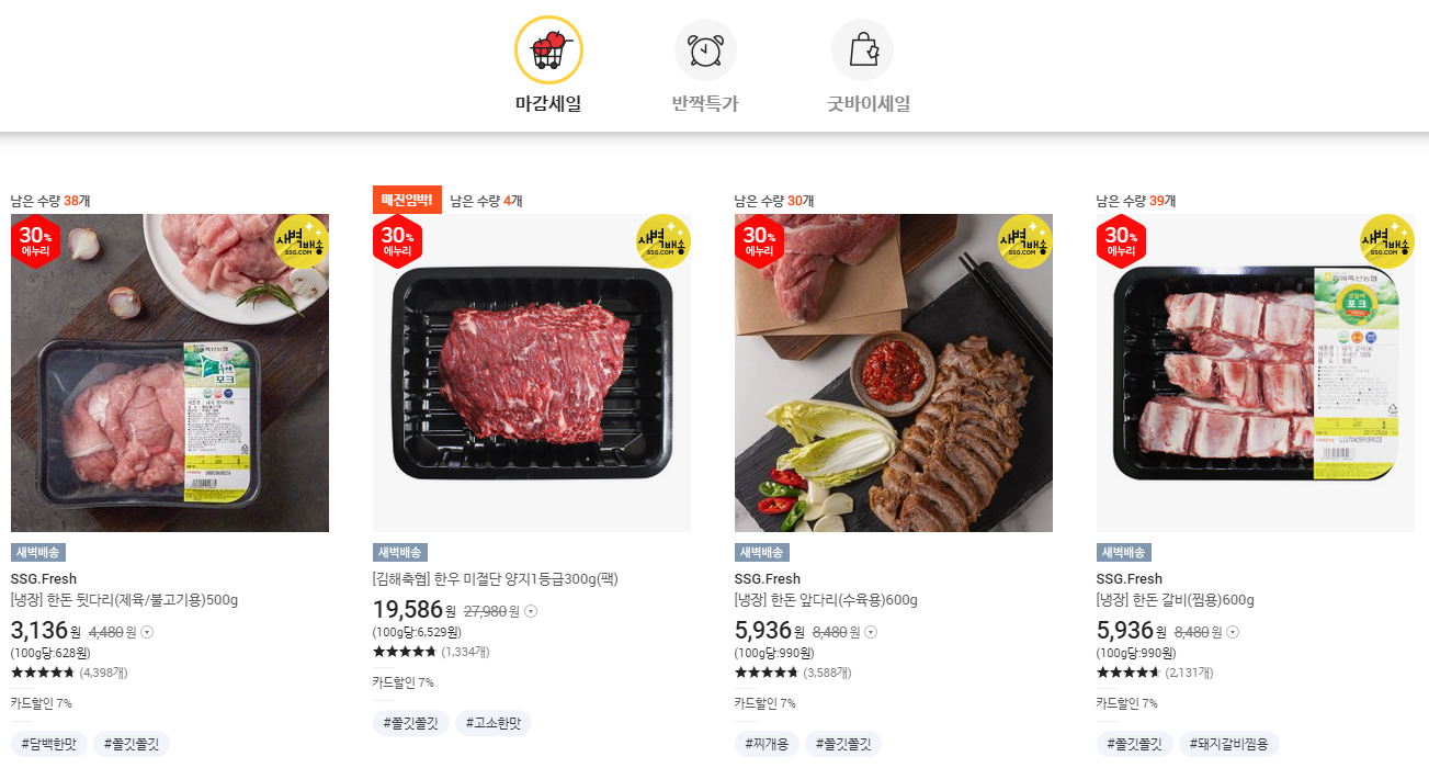 SSG 쓱닷컴 새벽배송의 마감세일 코너에 들어가보면 주로, 고기와 샐러드와 같은 신선식품 종류들을 30%에서 많게는 50%까지도 할인해서 판매하는 걸 볼 수 있습니다. 이미 대세가 된 각종 밀키트(감바스, 마라샹궈 등등) 제품도 자주 뜨는 편이예요.