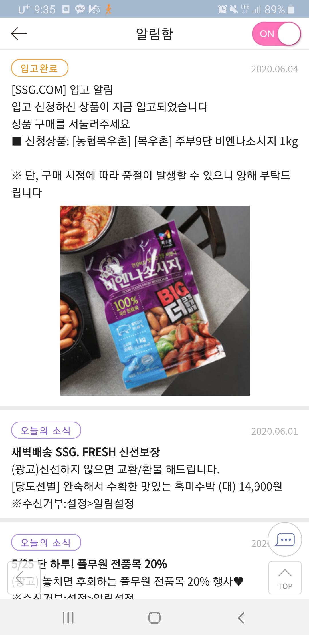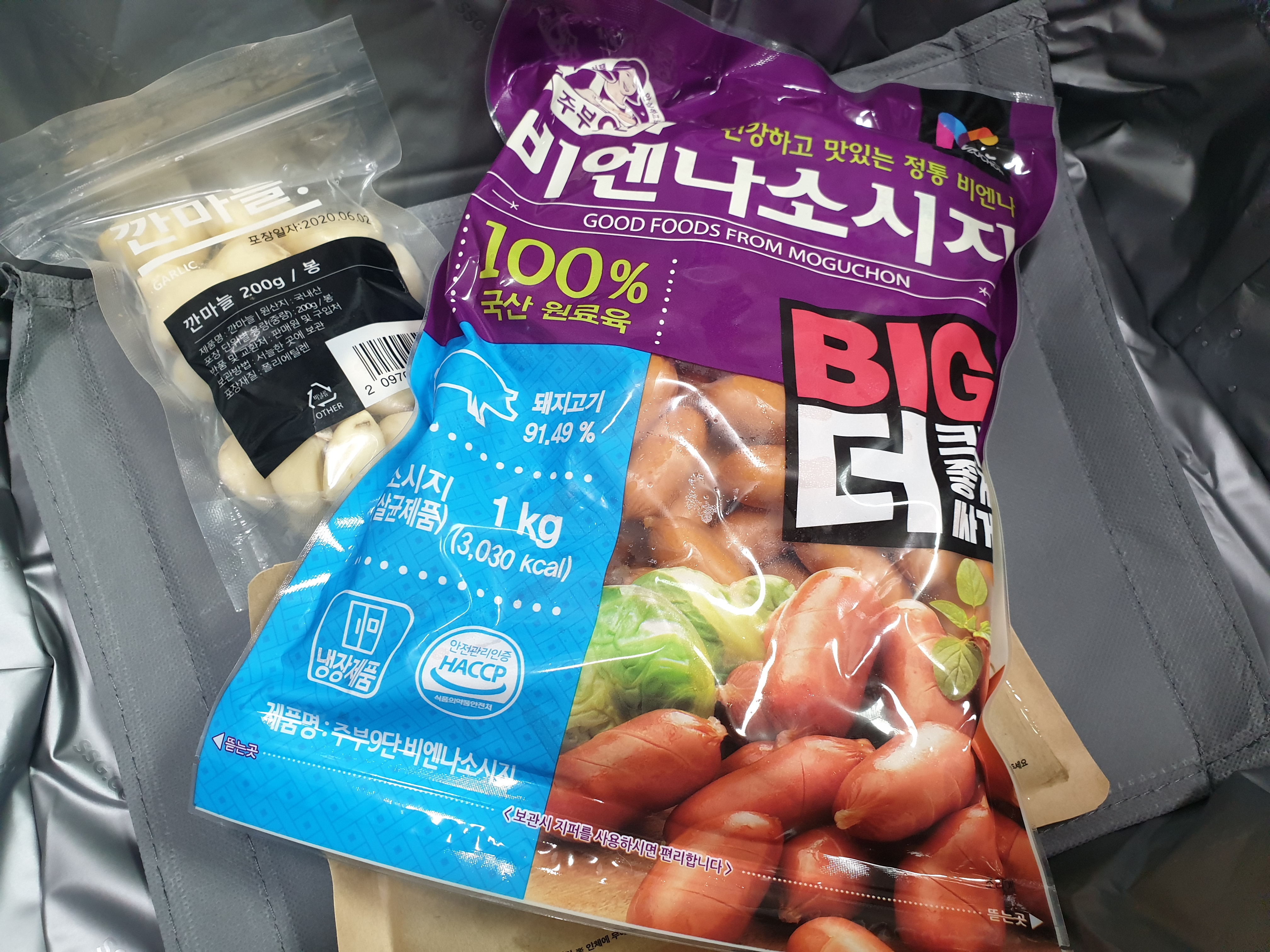 구매하려고 입고알림 신청해뒀던 목우촌 주부9단 비엔나소시지가 입고되었다는 알림이 뜨길래 바로 장바구니에 담아서 새벽배송 주문을 했어요.