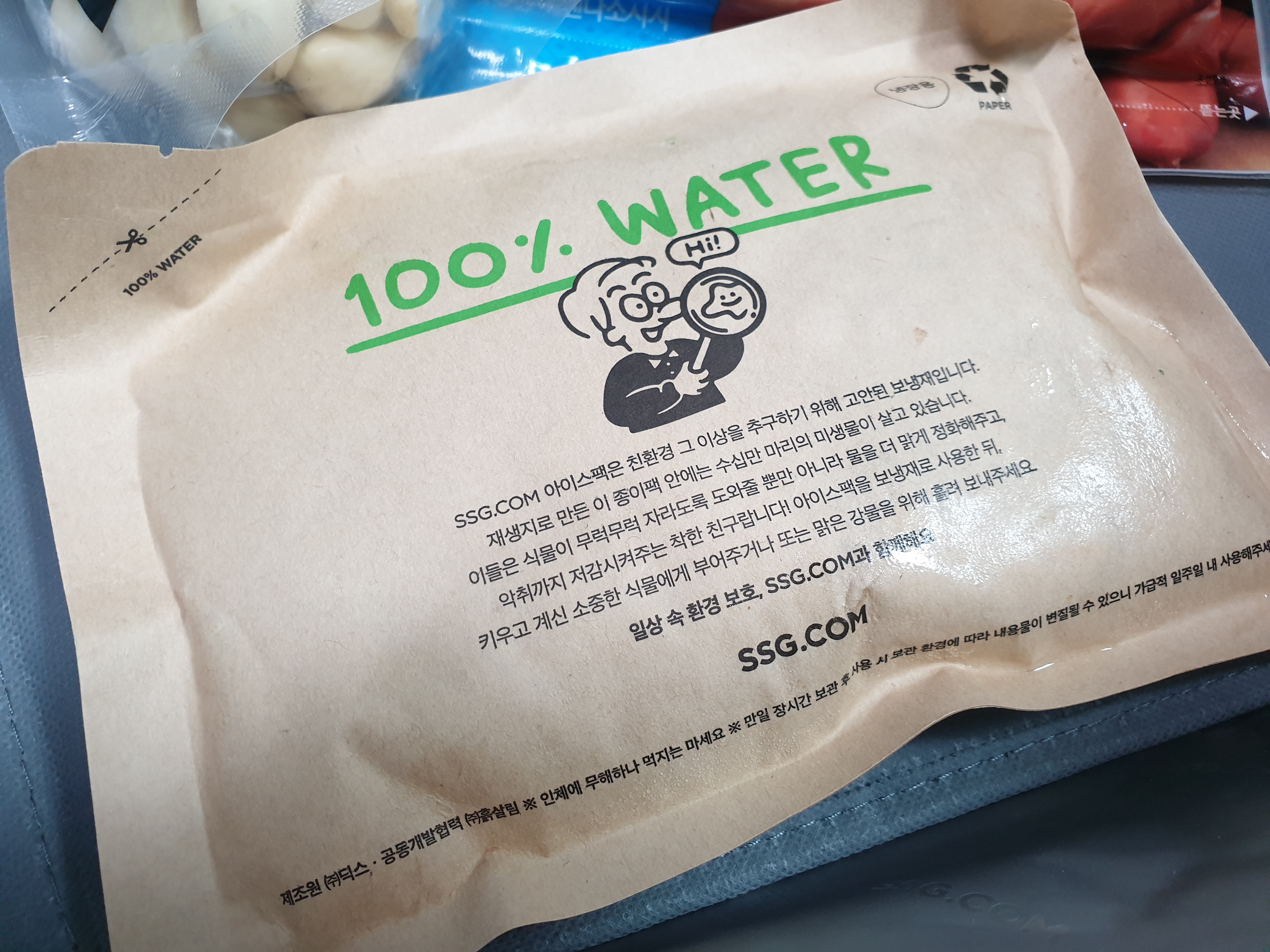 친환경 배송을 지향하는 쓱닷컴 새벽배송은 아이스팩도 100% 물로 만든 아이스팩을 사용하고 있어요. 처리할 때에는 절취선을 잘라서 팩 안의 물을 버리고, 포장지는 재활용 분리수거 하면 됩니다.
