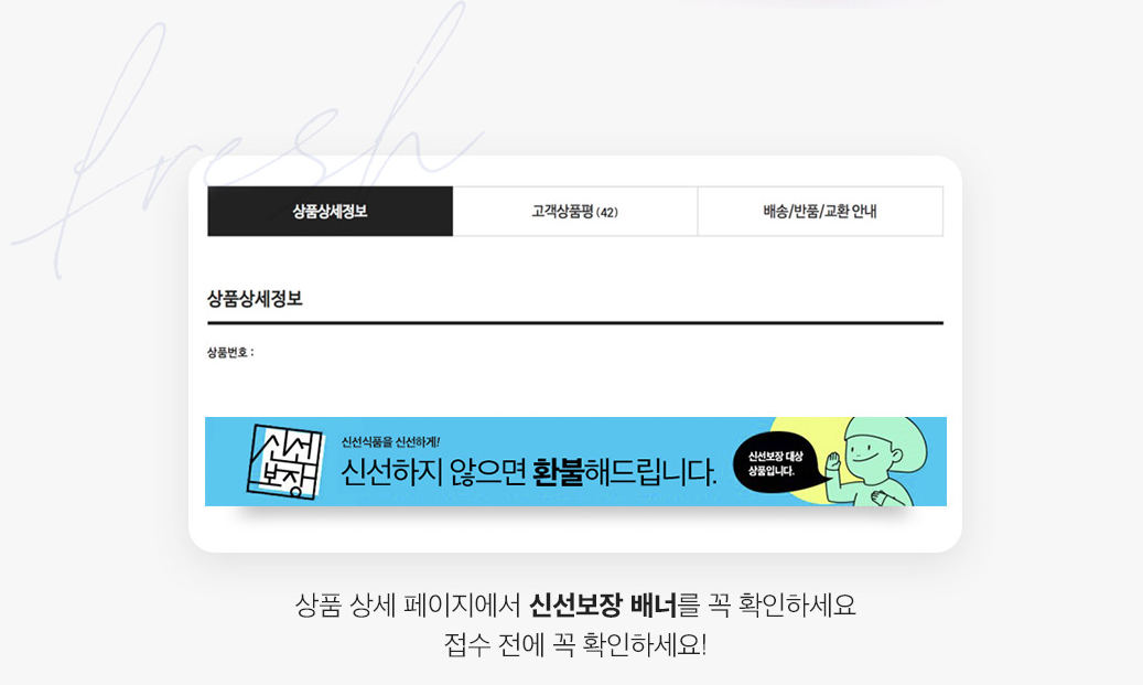 - 신선 보장 : 상품 상세페이지에 "신선보장 배너"가 있는 상품일 경우, 신선하지 않으면 환불해줍니다.