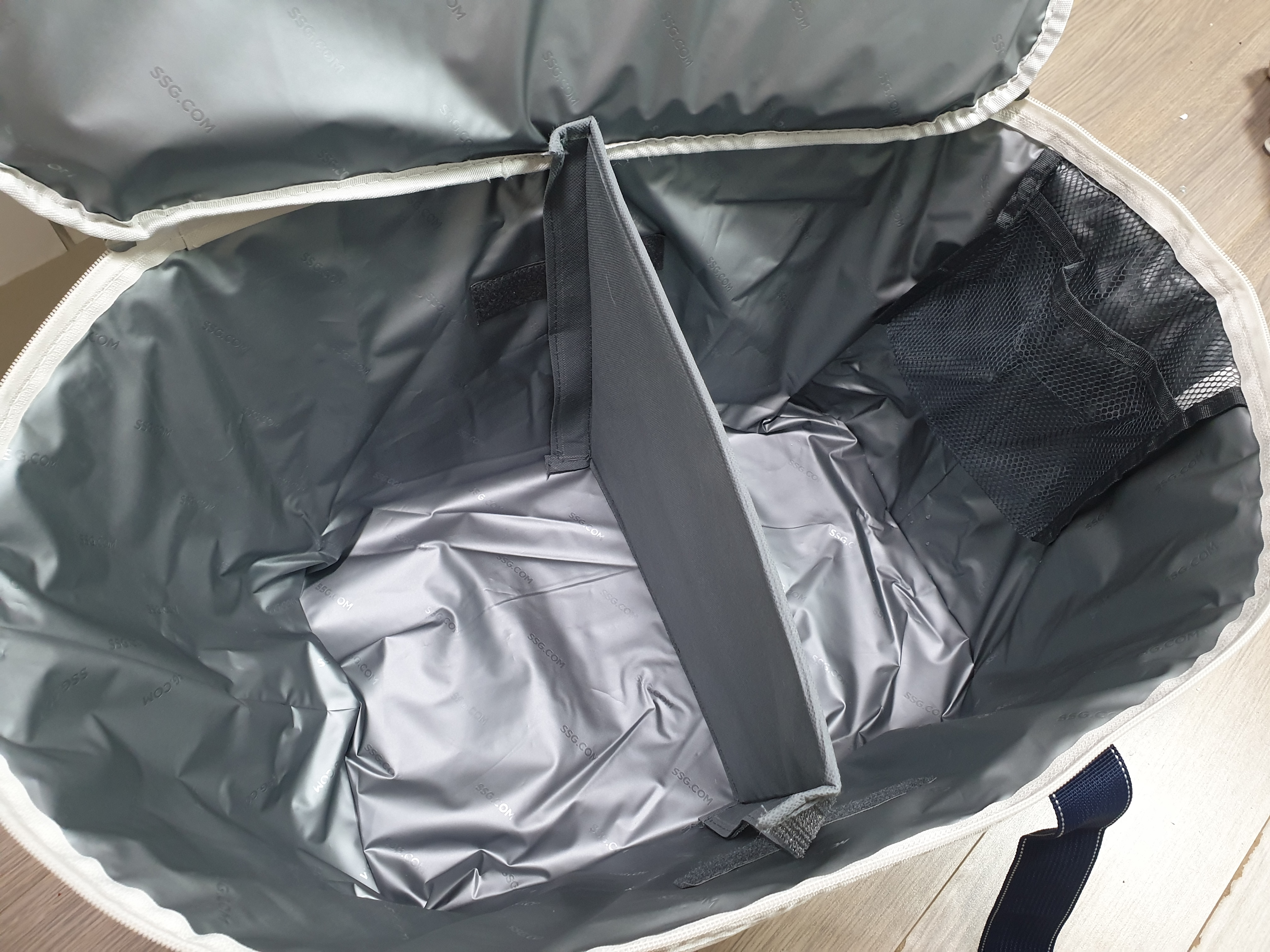 알비백은 9시간까지 보냉이 가능하다고 하는데요, 안쪽에는 젖지 않게 방수처리가 되어 있고, 보조주머니로 메쉬포켓도 있어요. 아래 깔려있는 것은 칸막이로, 세워서 부직포 부분을 고정시키면 내부를 2개 공간으로 분리도 가능해요 :)