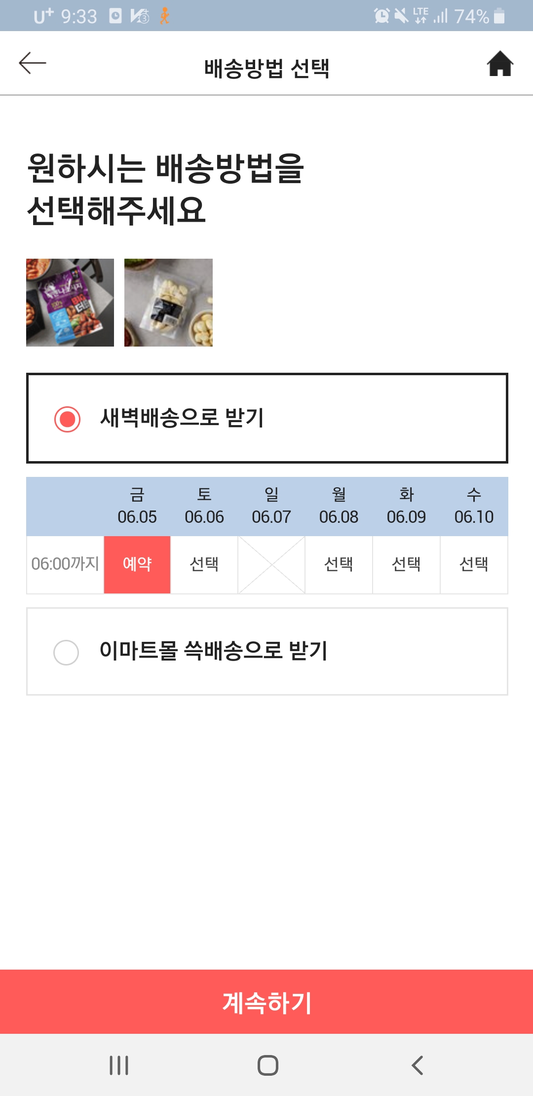 새벽배송은 주문일자 기준으로, 바로 다음날부터 6일 뒤의 날짜중에 선택이 가능해요. (단 일요일은 배송불가) 저는 바로 다음날인 6월 4일로 선택해서 주문을 완료했습니다.