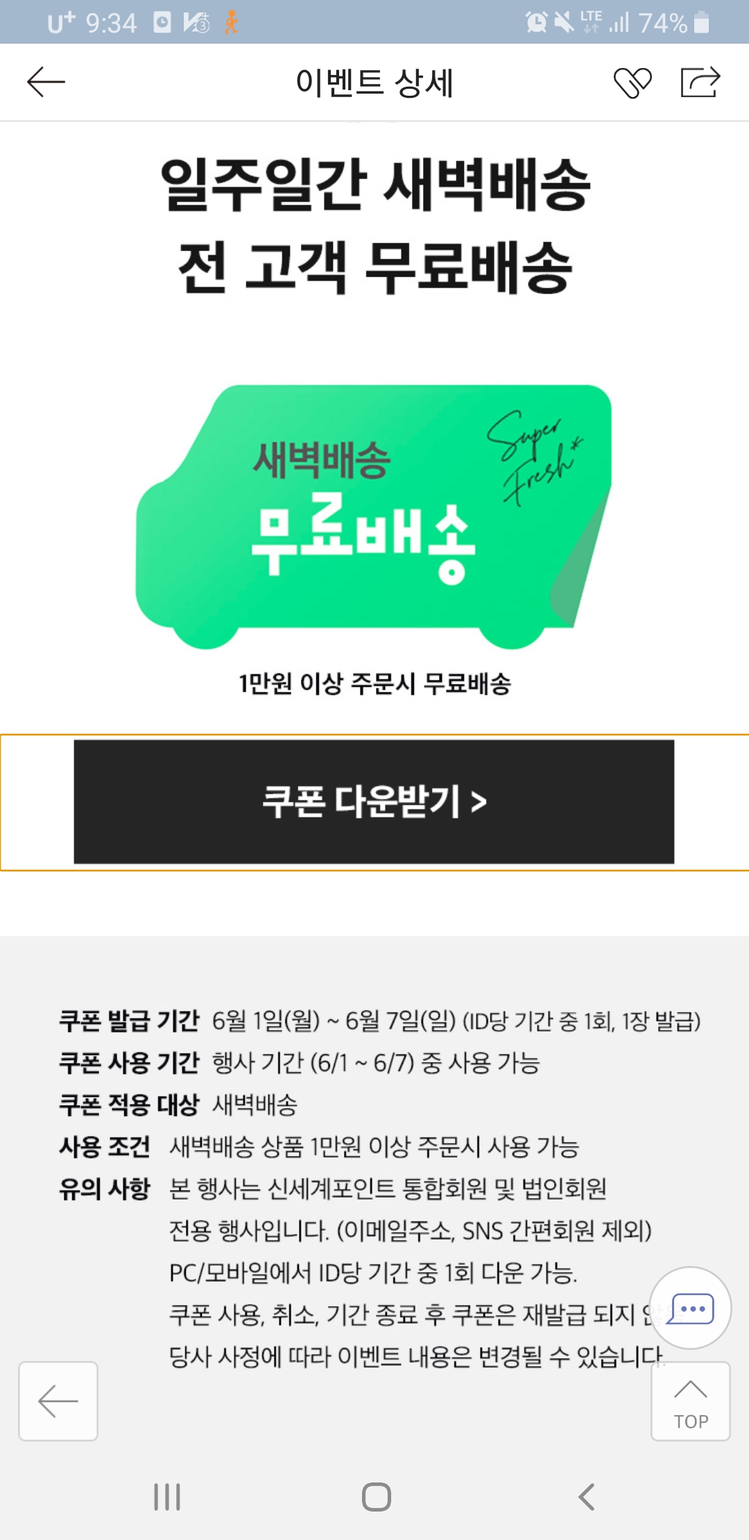 사실 저 같은 1인 가구는 한번에 장보는 양이 많지 않다보니, 새벽배송 서비스를 이용할때에 무료배송 조건(4만원 이상 구입)을 채우는 게 쉽지 않습니다. SSG 새벽배송은 종종 1만원 이상 구입 시 무료배송 쿠폰을 제공하고 있어요. 이런 이벤트를 잘 이용하면, 조금만 장 볼때에도 무료로 새벽배송 서비스를 받아 볼 수 있습니다 :)