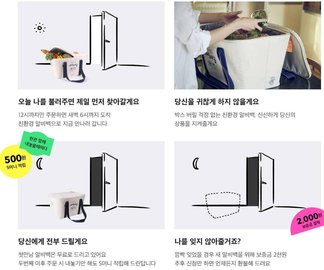 1. 새벽배송을 처음 주문하면 귀여운 알비백 보냉가방에 주문한 제품을 담아서 배송해줍니다(무료)