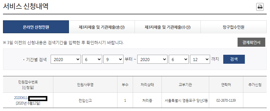 2) 접수를 하고 나면, 위와같이 관할 교부기관이 표시되고 연락처가 표시되는데요, 관할 주민센터 연락처로 전화해서 "주말(토요일 또는 일요일)에 전입할 예정이라서 금요일에 미리 전입신고를 하고 싶은데 기존에 세입자가 있는 상황이다" 라는 내용을 설명합니다.